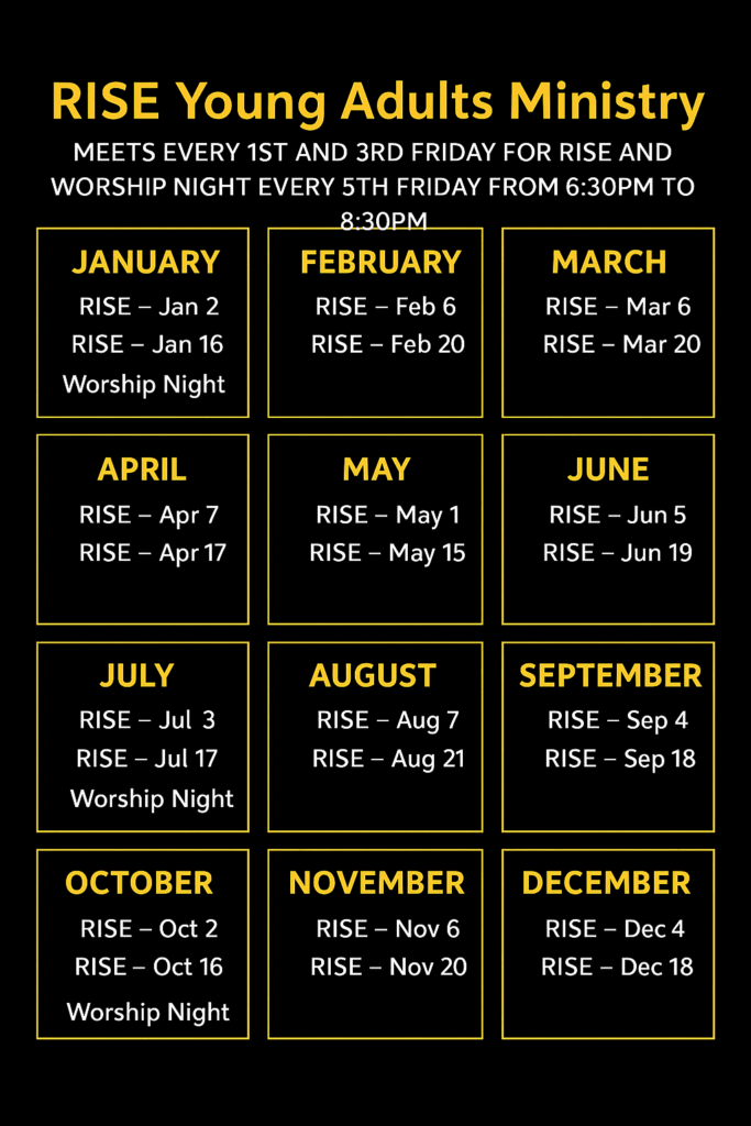 Looking for a place to grow, connect, and be real? Forget the surface-level small talk. RISE is a movement of unmarried young adults (18-30) who are serious about finding community and walking out their faith in a way that actually matters. This isn’t just a meeting—it’s where your life in Christ comes alive.
